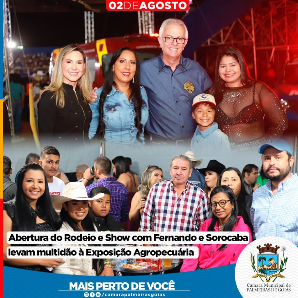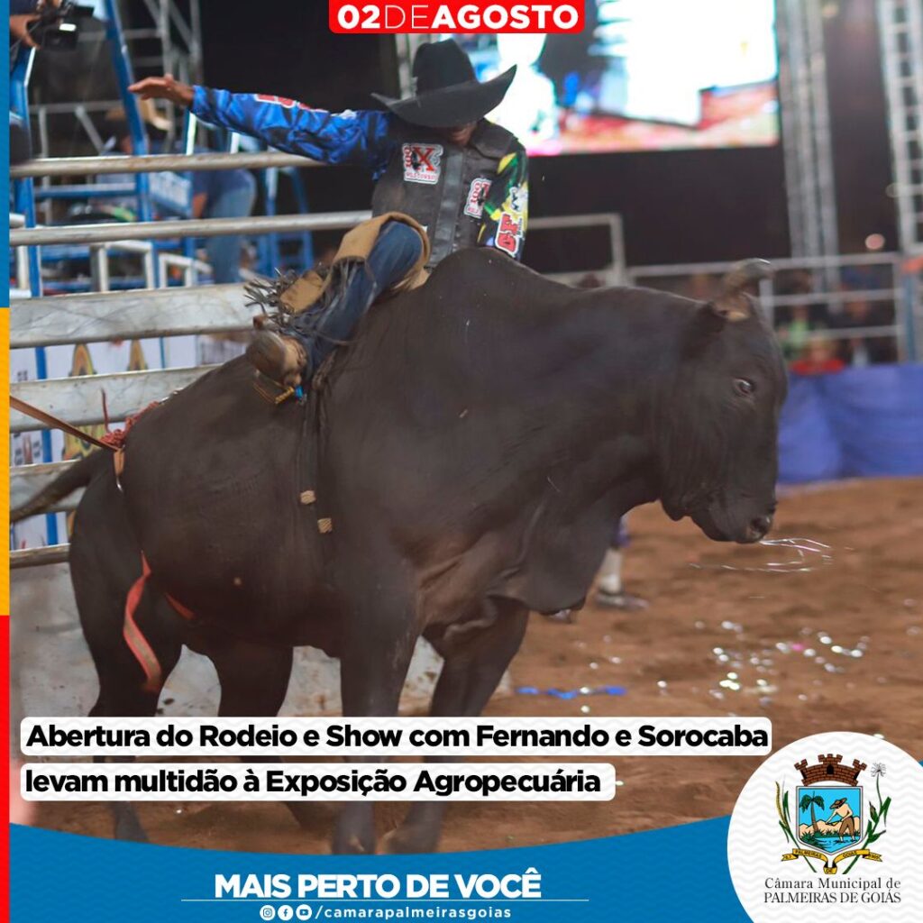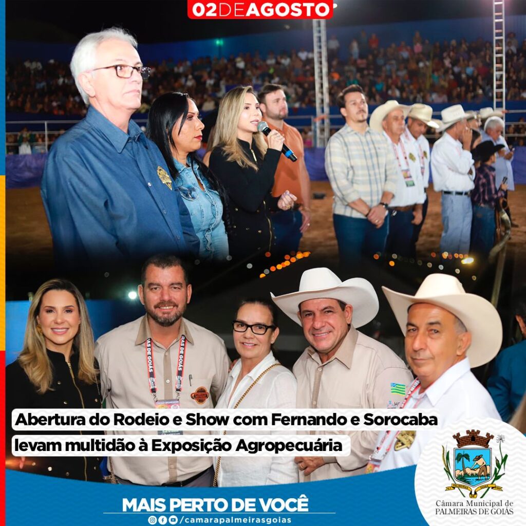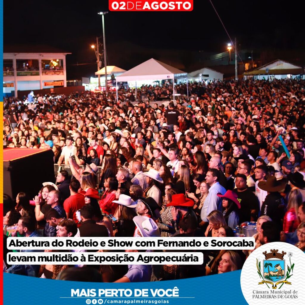 Nesta quarta-feira (2), a abertura do Rodeio com a narração de Juliano Reys e o Show com a dupla Fernando e Sorocaba na 34° Exposição Agropecuária de Palmeiras de Goiás arrastou multidões de todos os cantos do estado ao Parque Agropecuário Ministro Iris Rezende Machado, que se encontrou com essa alegria contagiante que só o povo palmeirense tem.