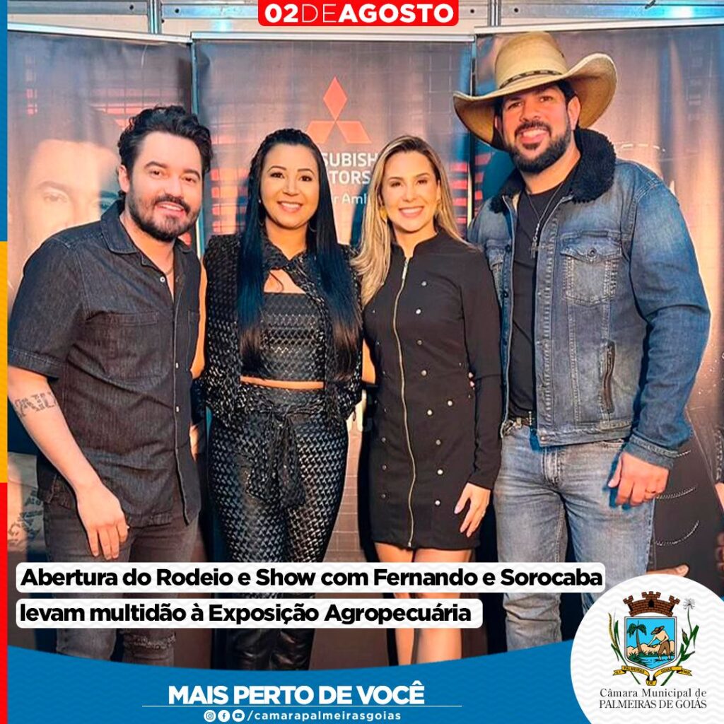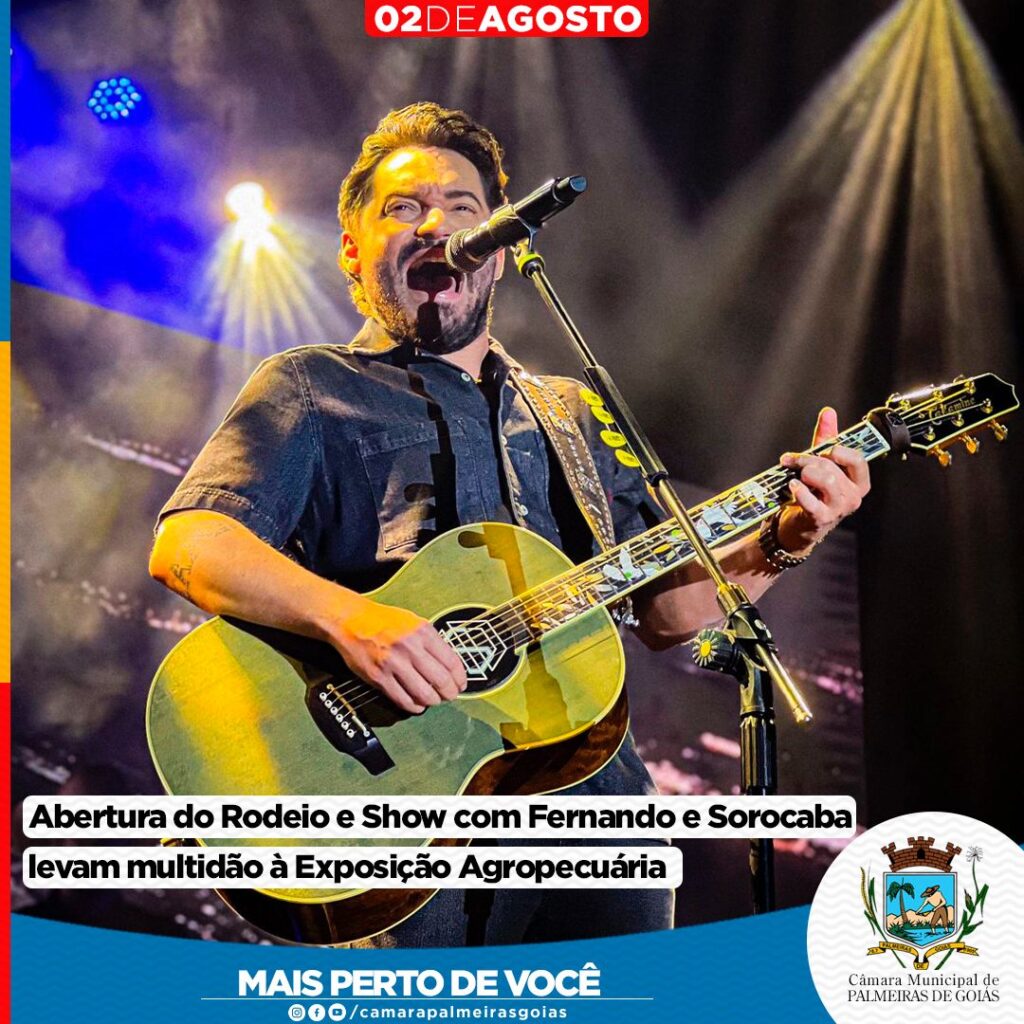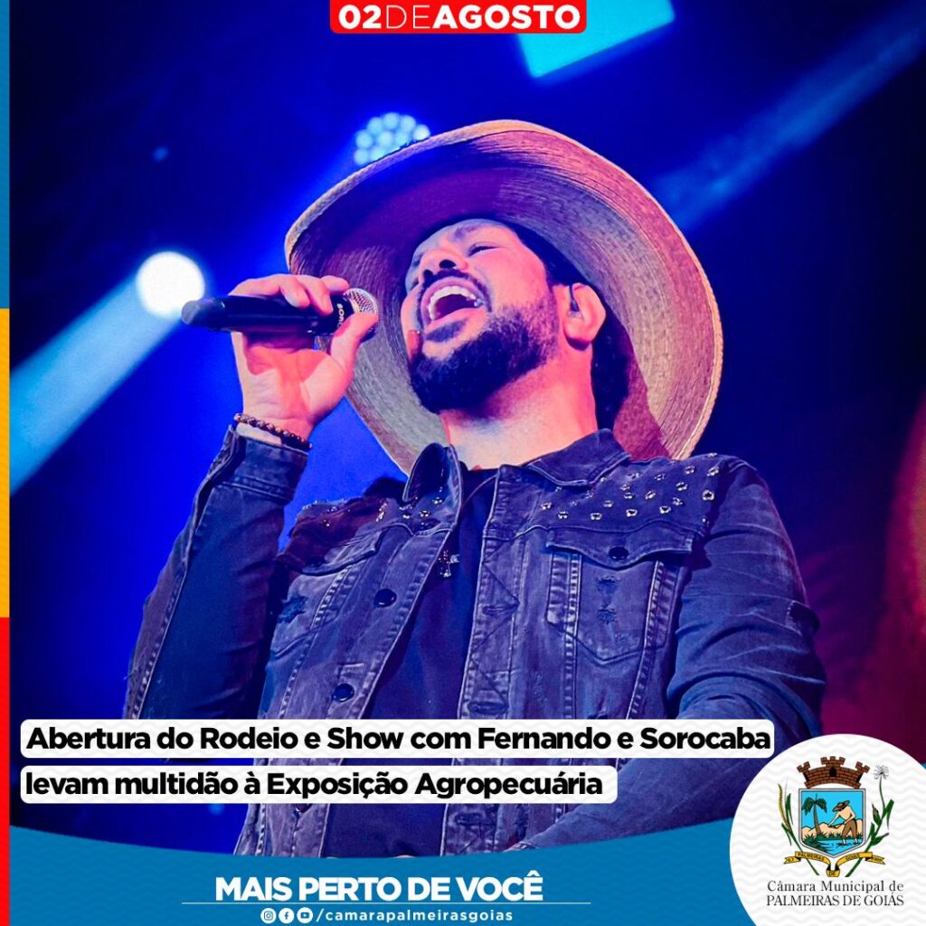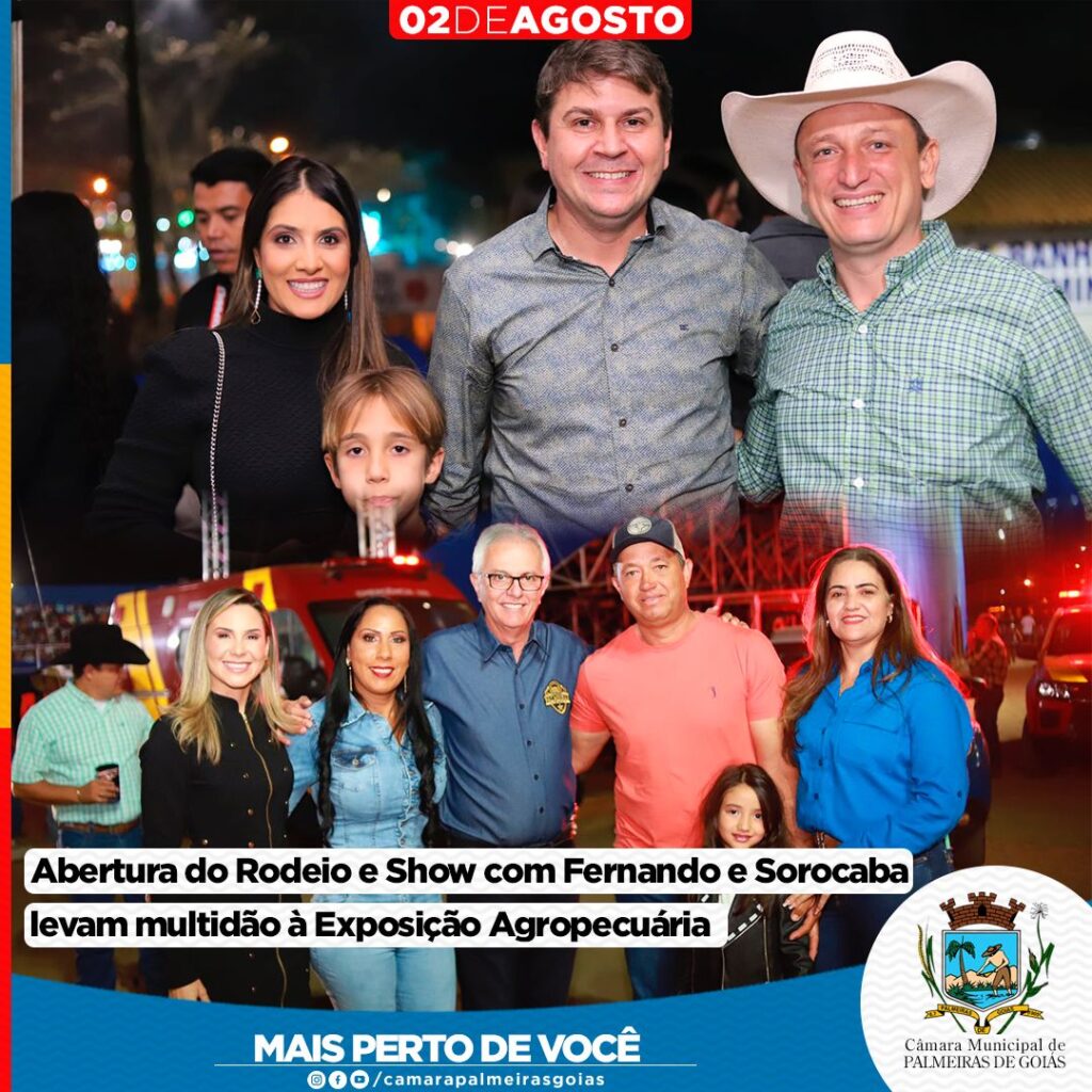 Nesta quarta-feira (2), a abertura do Rodeio com a narração de Juliano Reys e o Show com a dupla Fernando e Sorocaba na 34° Exposição Agropecuária de Palmeiras de Goiás arrastou multidões de todos os cantos do estado ao Parque Agropecuário Ministro Iris Rezende Machado, que se encontrou com essa alegria contagiante que só o povo palmeirense tem.